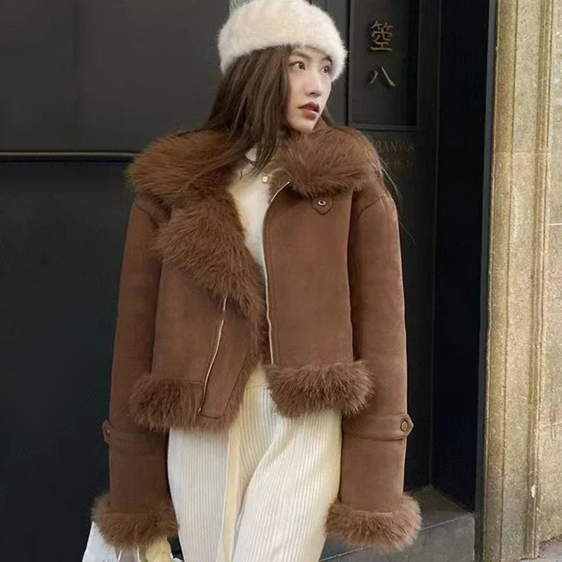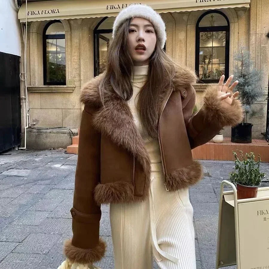 Winter Coat Women Faux Deerskin Leather Fur Jacket Fashion Streetwear Lapel Short Motorcycle Biker Coats Outwear Mujer Tops